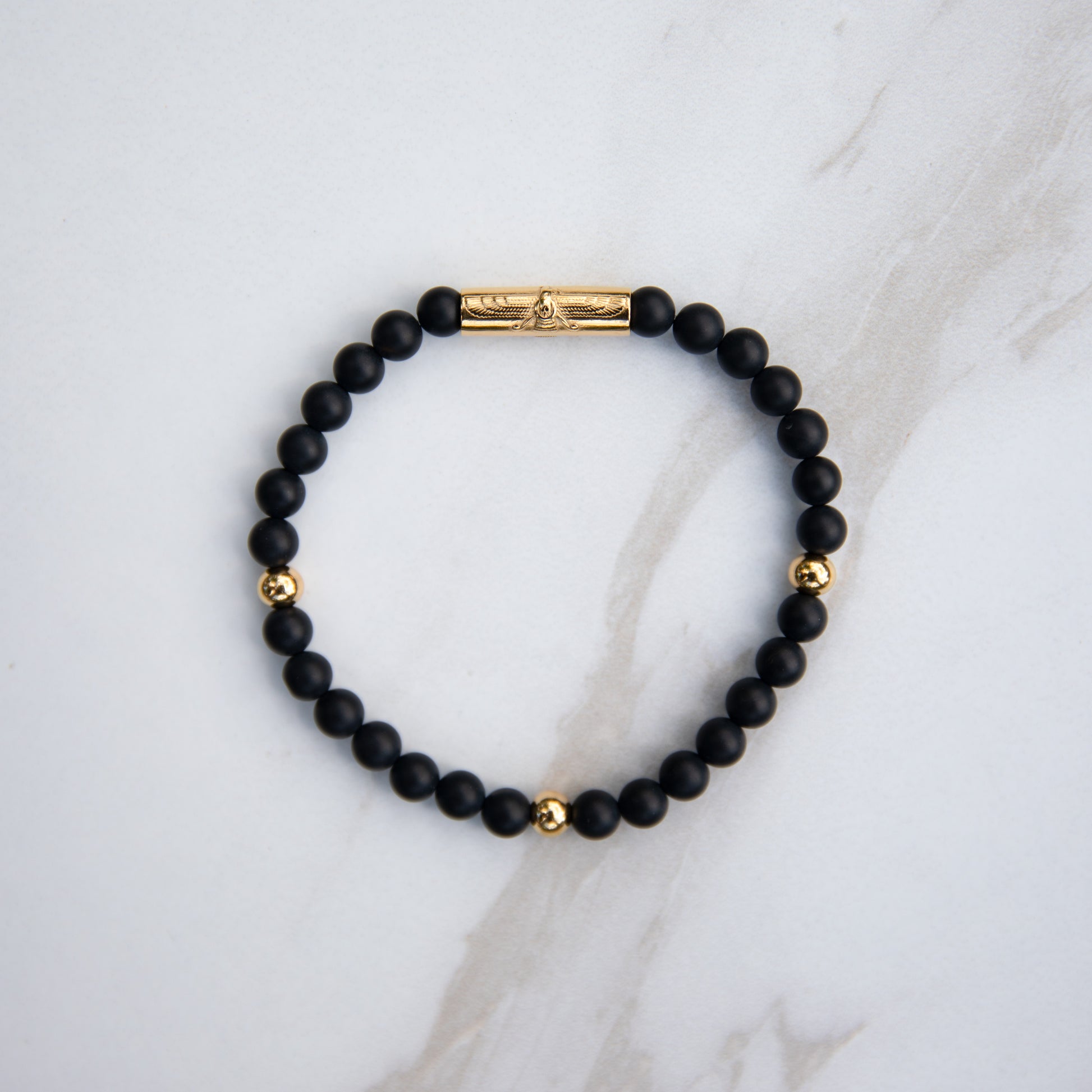 - Gemstones: The secondary material of this bracelet is Matte Black Onyx Gemstones, which are beautifully complemented by the three 18 Karat Gold-Plated 316L stainless steel beads.